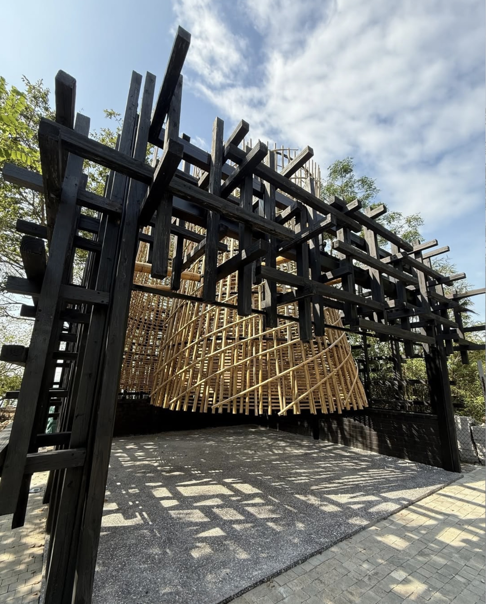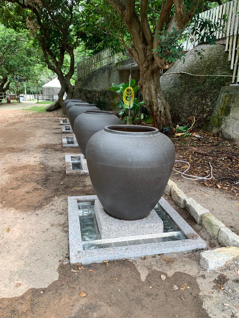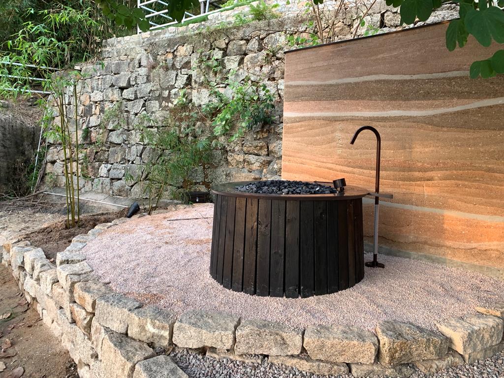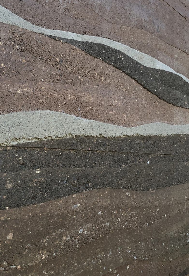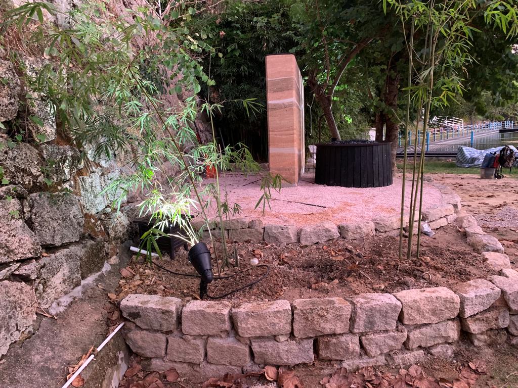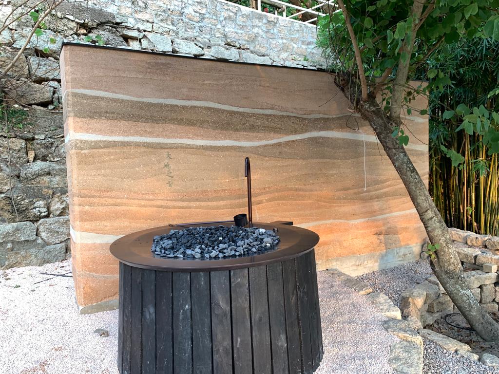 Ram earth feature wall, Chime well feature, pottery fountains, terrazzo tiles and Carbonised Wood Art Piece.